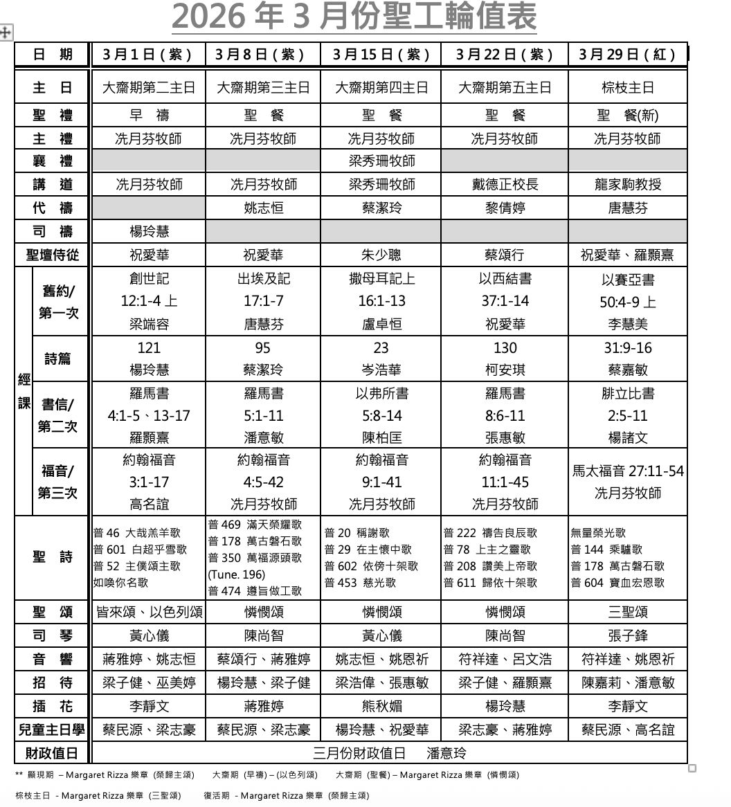 2026年3月聖工輪值表