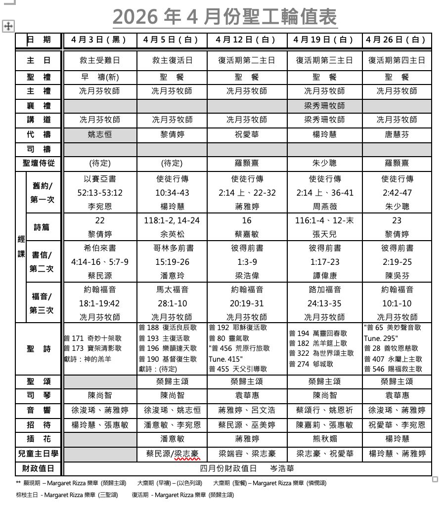 2026年4月聖工輪值表