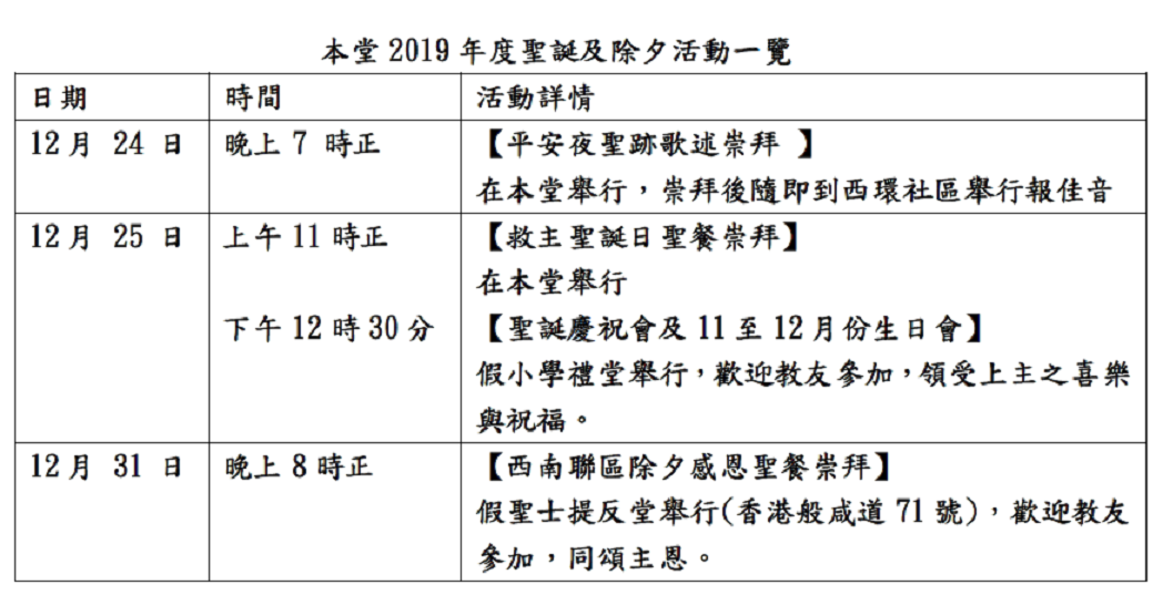 本堂2019年度聖誕及除夕活動一覽