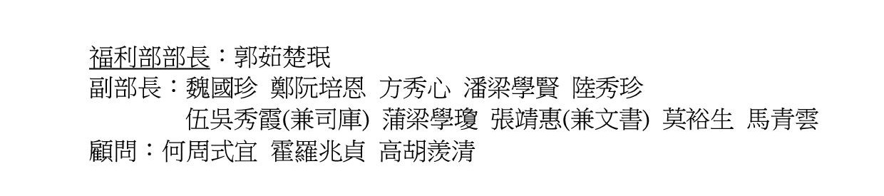 本部亦關注各註冊教友應享有之一切福利,樂意協助各教友辦理任何社會福利之補助津貼申請事宜,如有任何查詢,請與本堂牧者及福利部各正副部長聯絡,或透過幹事部同工代轉達。
