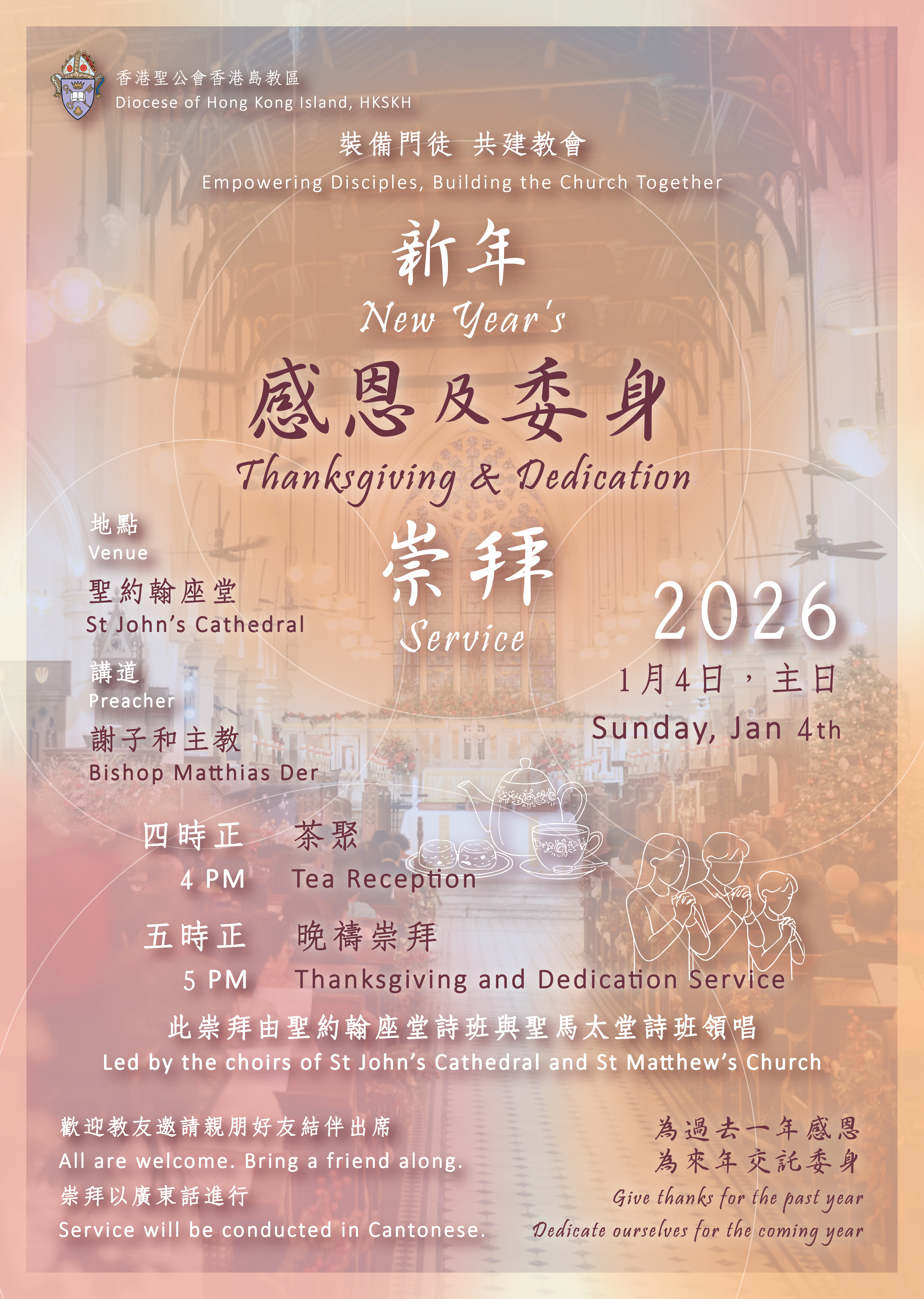 2026年即將來臨,讓我們一同崇拜向上主獻上感恩和委身的心志。香港島教區主教謝子和主教邀請各位主內兄姊出席2026新年感恩及委身崇拜(晚禱頌唱)。崇拜由謝子和主教講道,聖約翰座堂詩班及聖馬太堂詩班負責領唱。歡迎教友邀請親朋好友結伴出席。崇拜開始前設有主教茶聚時間,讓一眾教友可與謝主教和牧者們交談分享。