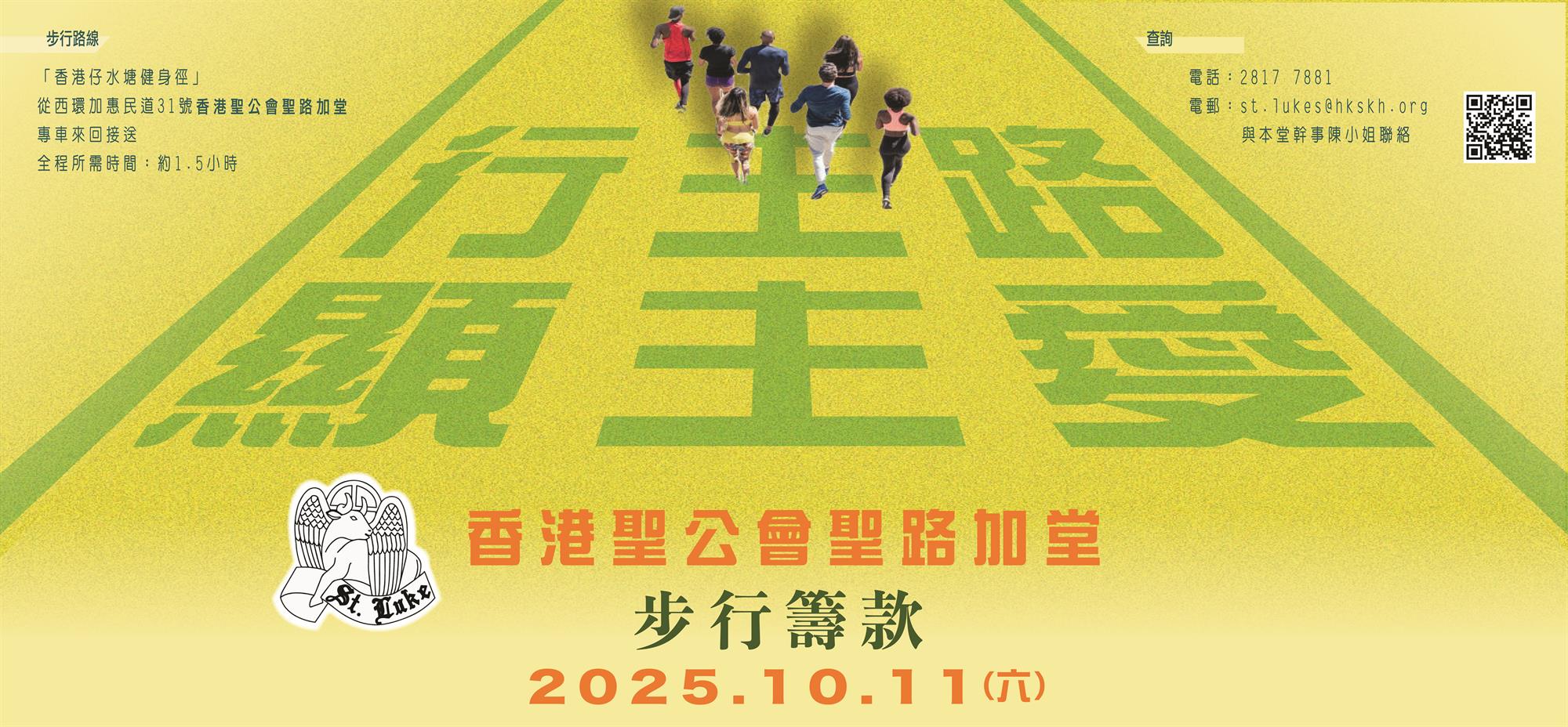 1>jpg.jpg) 「行主路、顯主愛 」步行籌款2025 目的及目標:為本堂的福傳、培育、牧養等需要籌募港幣二十萬元 步行日期:2025年10月11日(六) 集合時間及地點:上午8:30 於 聖路加堂集合 步行路線: 由西環加惠民道31號香港聖公會聖路加堂出發,乘專車到香港仔 水塘健身徑下車作為起點,沿健身徑經二號燒烤場折返起點,完成後上車返回聖公會呂明才紀念小學解散。全程所需時間約1.5小時。 步行籌款委員會主席:余詠茵 參與單位:香港聖公會聖路加堂、聖公會呂明才紀念小學、香港聖公會聖路加 福群會長者鄰舍中心、香港聖公會中西區長者日間護理中心及西南聯區友堂 《歡迎本堂教友及家人踴躍支持,為要向警方確定參與人數,請盡快向本堂幹事索取表格參加, 9月28日(下主日)截止報名。》 |